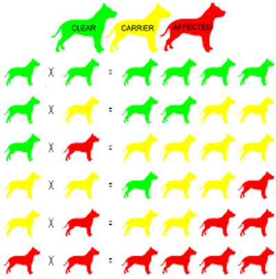 Genetic testing of the SOD1 gene in Australian shepherds will reliably determine whether a dog is a genetic Carrier of degenerative myelopathy. Degenerative Myelopathy is inherited in an Autosomal Recessive manner in dogs meaning that they must receive two copies of the mutated gene (one from each parent) to develop the disease. In general, carrier dogs do not have features of the disease but when bred with another carrier of the same Mutation, there is a risk of having affected pups. Each pup that is born to this pairing has a 25% chance of inheriting the disease and a 50% chance of inheriting one copy and being a carrier of the SOD1 gene mutation. Reliable genetic testing is important for determining breeding practices. Because symptoms may not appear until adulthood and some at-risk/affected dogs do not develop the disease, genetic testing should be performed before breeding. Until the exact modifying environmental or genetic factor is determined, genetic testing remains the only reliable way to detect neurological disease associated with this mutation prior to death. In order to eliminate this mutation from breeding lines and to avoid the potential of producing affected pups, breeding of known carriers to each other is not recommended. Australian shepherds that are not carriers of the mutation have no increased risk of having affected pups.
